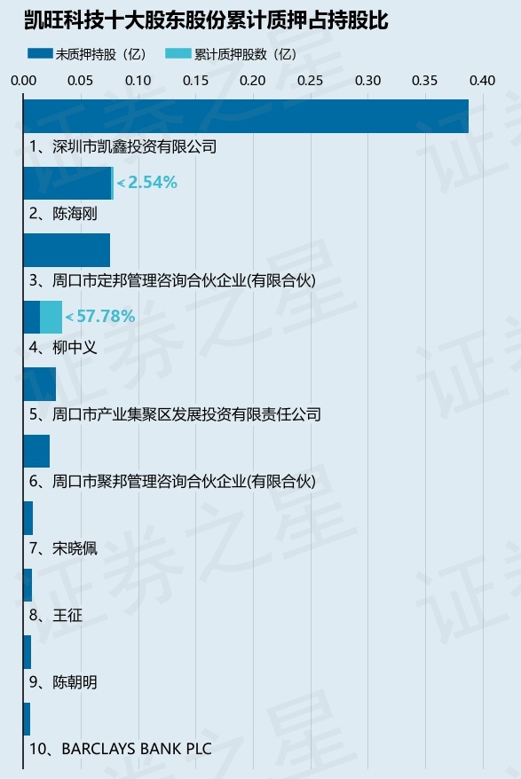 截止本公告日,股东陈海刚已累计质押股份20.0万股,占其持股总数的2.54%,股东柳中义已累计质押股份195.0万股,占其持股总数的57.78%。本次质押后凯旺科技十大股东的累计质押股份占持股比例(占持股比例的计算以公司最新一期财务报表公布的十大股东的持股总数为基准)见下图: