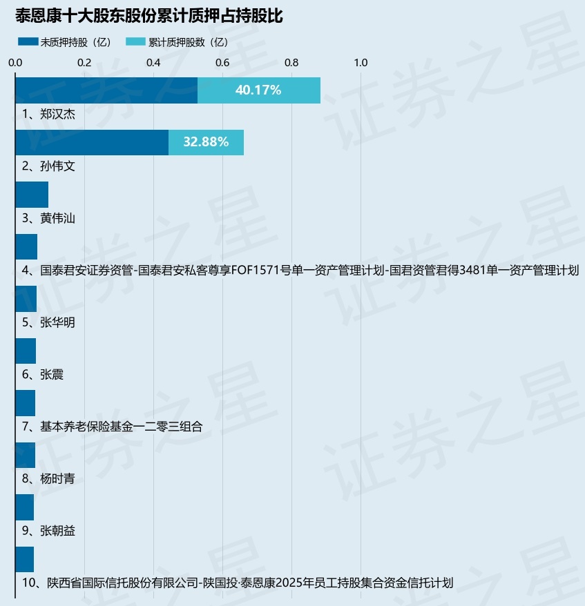 截止本公告日,股东郑汉杰已累计质押股份3550.0万股,占其持股总数的40.17%,股东孙伟文已累计质押股份2177.0万股,占其持股总数的32.88%。本次质押后泰恩康十大股东的累计质押股份占持股比例(占持股比例的计算以公司最新一期财务报表公布的十大股东的持股总数为基准)见下图: