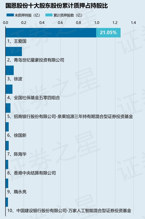 截止本公告日,股东王爱国已累计质押股份2652.0万股,占其持股总数的21.05%。本次质押后国恩股份十大股东的累计质押股份占持股比例(占持股比例的计算以公司最新一期财务报表公布的十大股东的持股总数为基准)见下图: