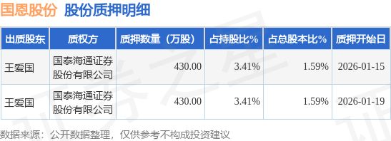 证券之星消息,国恩股份(002768)1月21日公开信息显示,股东王爱国向国泰海通证券股份有限公司合计质押860.0万股,占总股本3.18%。质押详情见下表: