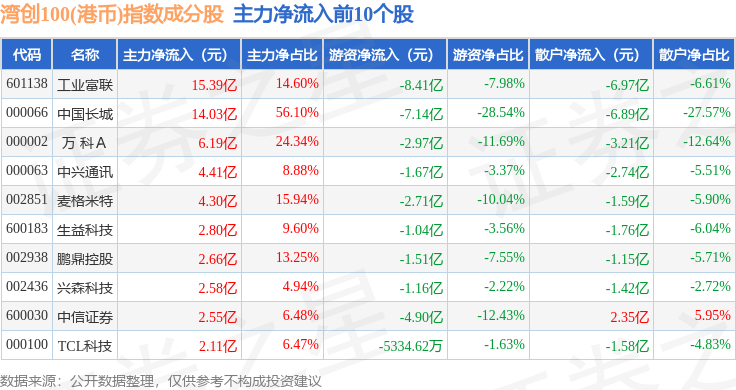 资金流向方面,湾创100(港币)(980002)指数成份股当日主力资金净流入合计22.15亿元,游资资金净流出合计42.79亿元,散户资金净流入合计20.64亿元。成份股资金流向详情见下表: