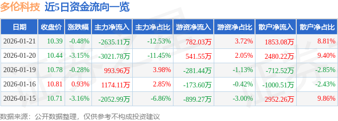 证券之星消息,截至2026年1月21日收盘,多伦科技(603528)报收于10.39元,下跌0.48%,换手率2.85%,成交量20.15万手,成交额2.1亿元。
