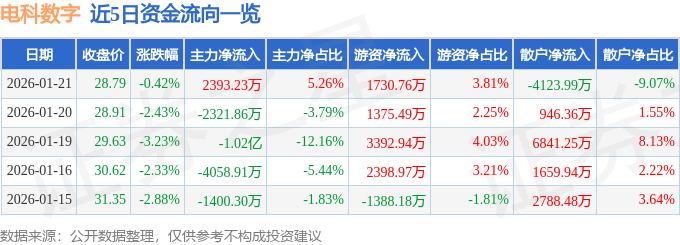 证券之星消息,截至2026年1月21日收盘,电科数字(600850)报收于28.79元,下跌0.42%,换手率2.31%,成交量15.74万手,成交额4.55亿元。