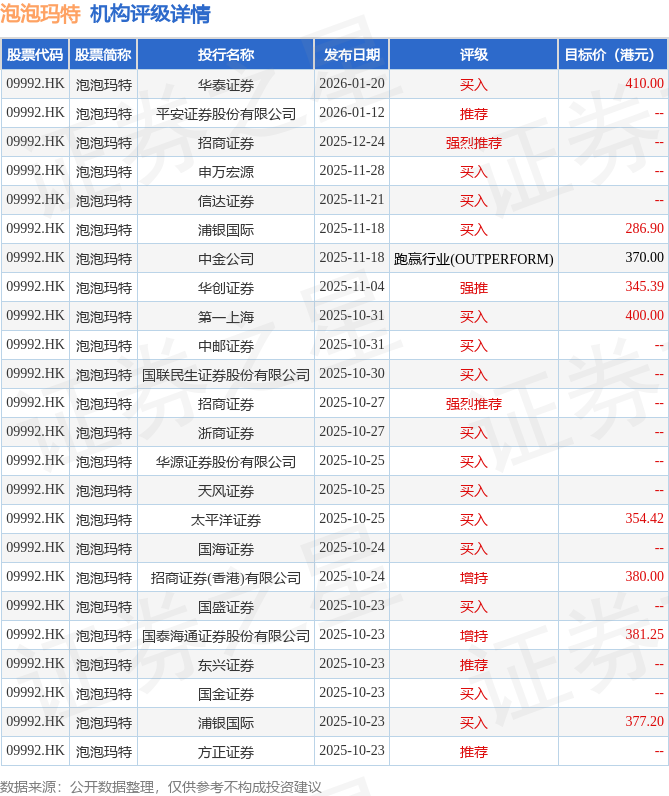 截至2026年1月21日收盘,泡泡玛特(09992.HK)报收于194.4港元,下跌1.42%,成交量1265.3万股,成交额24.45亿港元。投行对该股的评级以买入为主,近90天内共有15家投行给出买入评级,近90天的目标均价为367.24港元。华泰证券最新一份研报给予泡泡玛特买入评级,目标价410港元。