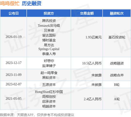 证券之星消息,根据天眼查APP于1月19日公布的信息整理,湖南鸣鸣很忙商业连锁股份有限公司基石投资轮融资,融资额1.95亿美元,参与投资的机构包括腾讯投资,Temasek淡马锡,贝莱德,富达国际,博时基金,易方达,Springs Capital,泰康人寿。