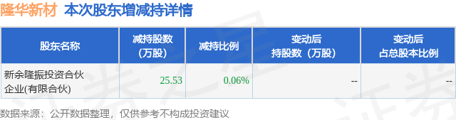 证券之星消息,1月21日隆华新材发布公告《隆华新材:关于控股股东、实际控制人之一及其一致行动人股份减持计划实施完毕的公告》,其股东新余隆振投资合伙企业(有限合伙)于2026年1月15日至2026年1月20日间合计减持25.53万股,占公司目前总股本的0.0594%,变动期间该股股价上涨4.36%,截止1月20日收盘报11.48元。