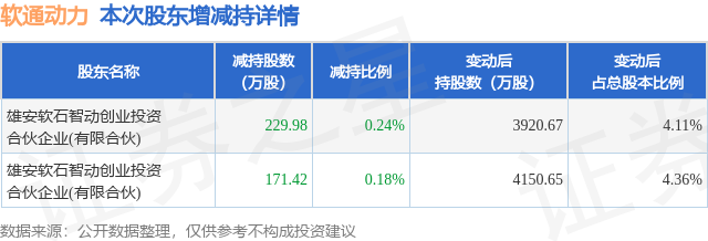 证券之星消息,1月21日软通动力发布公告《软通动力:关于控股股东、实际控制人及其一致行动人减持计划期限届满暨减持股份实施情况的公告》,其股东雄安软石智动创业投资合伙企业(有限合伙)于2025年11月19日至2026年1月20日间合计减持401.4万股,占公司目前总股本的0.4212%,变动期间该股股价下跌4.11%,截止1月20日收盘报50.16元。