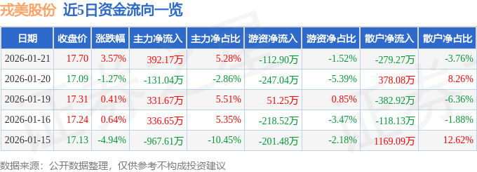 证券之星消息,截至2026年1月21日收盘,戎美股份(301088)报收于17.7元,上涨3.57%,换手率2.27%,成交量4.27万手,成交额7434.21万元。