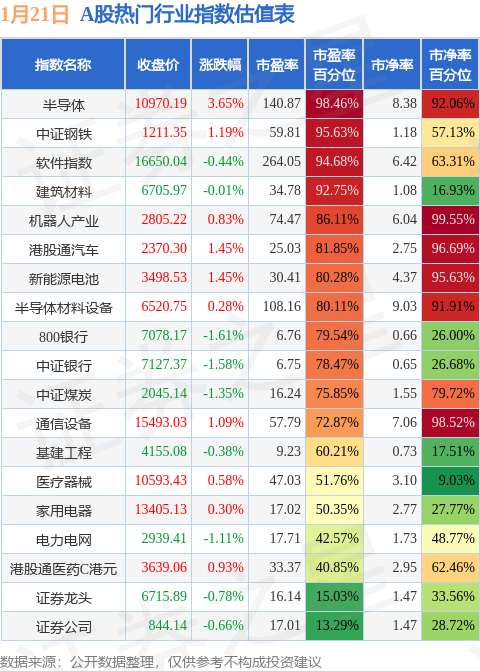 热门行业指数方面,半导体的市盈率百分位较高,为98.46%。而证券公司的市盈率百分位较低,为13.29%。