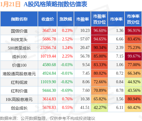 风格策略指数方面,国信价值的市盈率百分位较高,为96.6%。而创业成长的市盈率百分位较低,为42.27%。