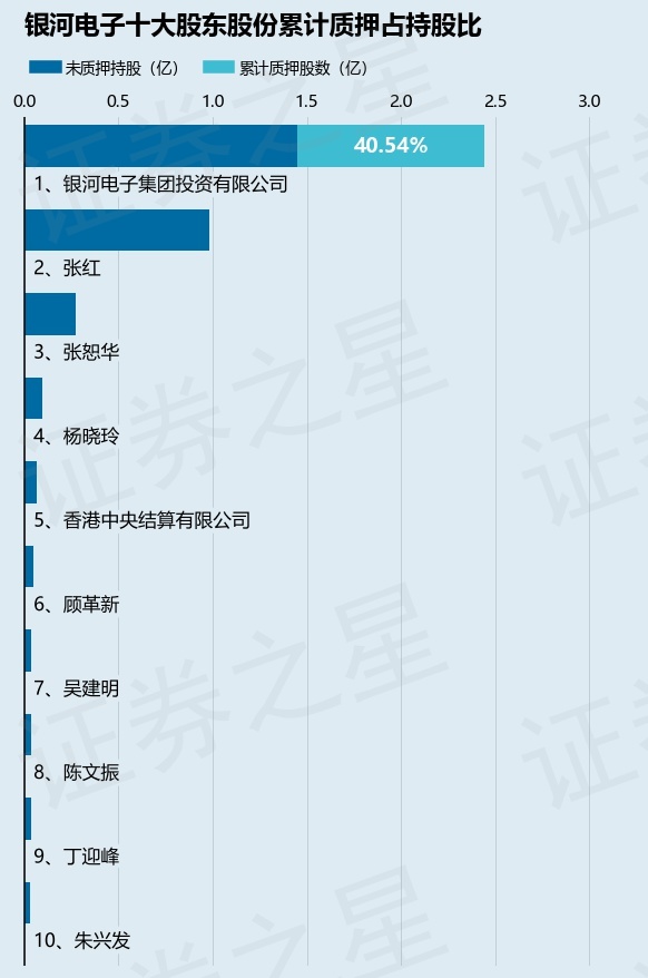 截止本公告日,股东银河电子集团投资有限公司已累计质押股份9900.0万股,占其持股总数的40.54%。本次质押后银河电子十大股东的累计质押股份占持股比例(占持股比例的计算以公司最新一期财务报表公布的十大股东的持股总数为基准)见下图: