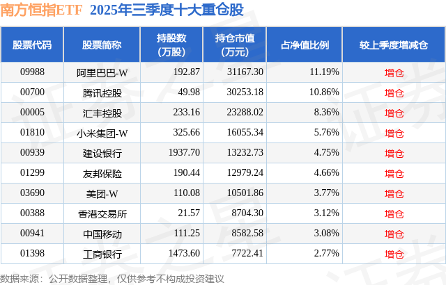 南方恒指ETF基金成立于2014年12月23日,基金经理为罗文杰,基金跟踪标的为恒生指数,成立以来超额回报为32.3%,近一个月超额回报为-0.53%。最新披露的基金持仓数据显示,截止2025年9月30日,该基金第一大重仓股为阿里巴巴-W(09988),持股占比为11.19%。