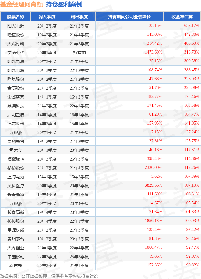 何肖颉管理的工银新趋势灵活配置混合A基金在20年2季度买入阳光电源,在持有1年又0个季度后在21年2季度卖出。持有期间的估算收益率为657.17%,持有期间阳光电源在2020年到2021年的年报营业总收入增幅达25.15%。