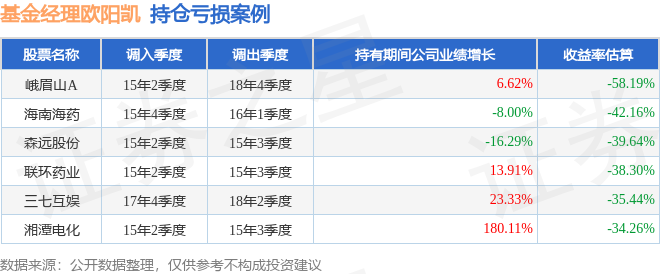 欧阳凯管理的工银瑞信双利债券A基金在15年2季度买入峨眉山A,在持有3年又2个季度后在18年4季度卖出。持有期间的估算收益率为-58.19%,持有期间峨眉山A在2015年到2018年的年报归属净利润增幅达6.62%。