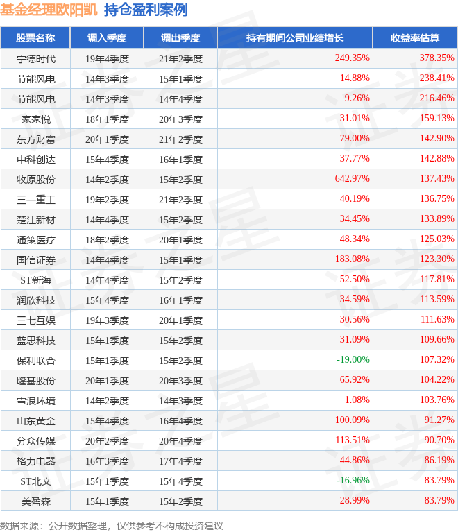 欧阳凯管理的工银新财富灵活配置混合基金在19年4季度买入宁德时代,在持有1年又2个季度后在21年2季度卖出。持有期间的估算收益率为378.35%,持有期间宁德时代在2019年到2021年的年报归属净利润增幅达249.35%。