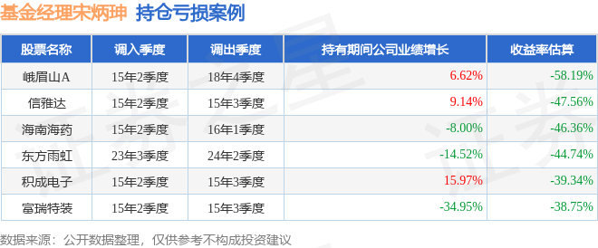 宋炳珅管理的工银瑞信双利债券A基金在15年2季度买入峨眉山A,在持有3年又2个季度后在18年4季度卖出。持有期间的估算收益率为-58.19%,持有期间峨眉山A在2015年到2018年的年报归属净利润增幅达6.62%。