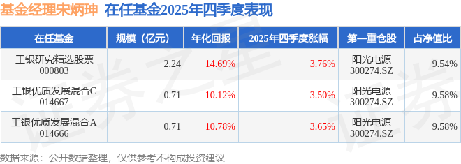 宋炳珅管理的工银研究精选股票基金在20年2季度买入阳光电源,在持有2个季度后在20年4季度卖出。持有期间的估算收益率为319.45%,持有期间阳光电源在2019年到2020年的年报归属净利润增幅达118.96%。