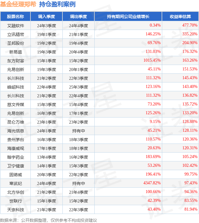 郑希管理的易方达北交所精选两年定开混合A基金在24年3季度买入艾融软件,在持有1个季度后在24年4季度卖出。持有期间的估算收益率为477.7%,持有期间艾融软件在2023年到2024年的年报营业总收入增幅达0.34%。