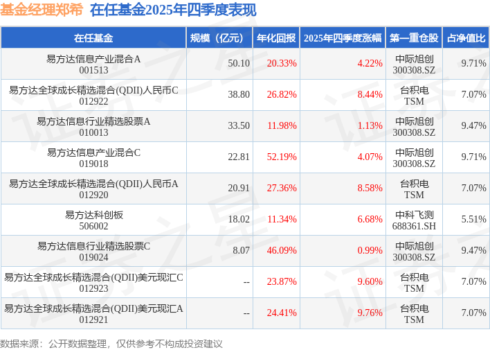 郑希管理的易方达科创板基金在20年3季度买入固德威,在持有1年又3个季度后在22年2季度卖出。持有期间的估算收益率为99.75%,持有期间固德威在2020年到2022年的年报营业总收入增幅达196.41%。