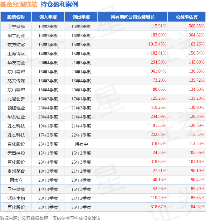 陈皓管理的易方达平稳增长混合基金在13年2季度买入卫宁健康,在持有2年又1个季度后在15年3季度卖出。持有期间的估算收益率为569.35%,持有期间卫宁健康在2013年到2015年的年报营业总收入增幅达115.91%。