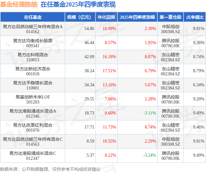证券之星消息,截止2025年四季度末,基金经理陈皓旗下共管理10只基金,本季度表现最佳的为易方达科翔混合(110013),季度净值涨8.87%。
