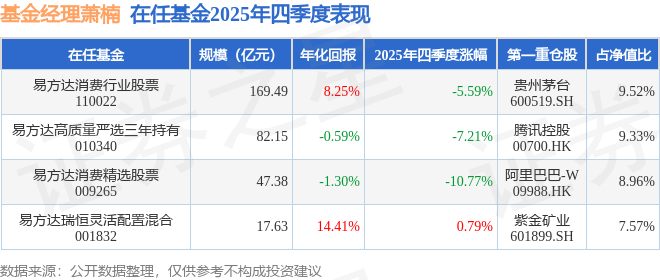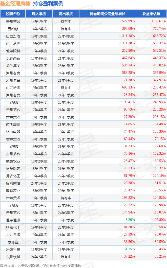 萧楠管理的易方达消费行业股票基金在14年1季度买入贵州茅台,已连续持有11年又3个季度。持有期间的估算收益率为1188.61%,持有期间贵州茅台在2014年到2025年的中报归属净利润增幅达527.99%。