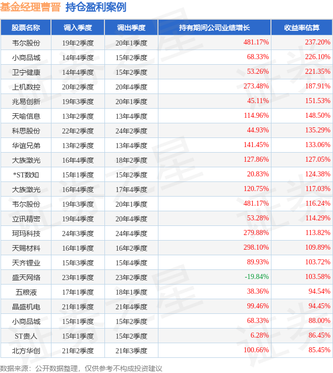 曹晋管理的富国中小盘精选混合A基金在19年2季度买入韦尔股份,在持有3个季度后在20年1季度卖出。持有期间的估算收益率为237.2%,持有期间韦尔股份在2019年到2020年的年报归属净利润增幅达481.17%。