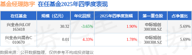 证券之星消息,截止2025年四季度末,基金经理陈宇旗下共管理2只基金,本季度表现最佳的为兴全合兴LOF(163418),季度净值涨1.9%。