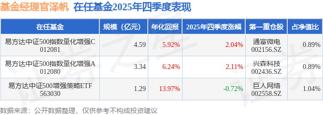 证券之星消息,截止2025年四季度末,基金经理官泽帆旗下共管理3只基金,本季度表现最佳的为易方达中证500指数量化增强A(012080),季度净值涨2.11%。