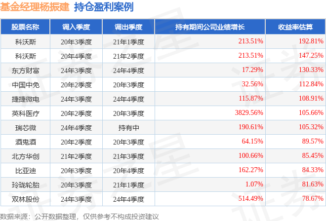 杨振建管理的博时银智大数据100A基金在20年3季度买入科沃斯,在持有2个季度后在21年1季度卖出。持有期间的估算收益率为192.81%,持有期间科沃斯在2020年到2021年的年报归属净利润增幅达213.51%。