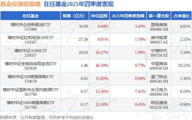 证券之星消息,截止2025年四季度末,基金经理杨振建旗下共管理7只基金,本季度表现最佳的为博时中证全指自由现金流ETF(563830),季度净值涨9.73%。