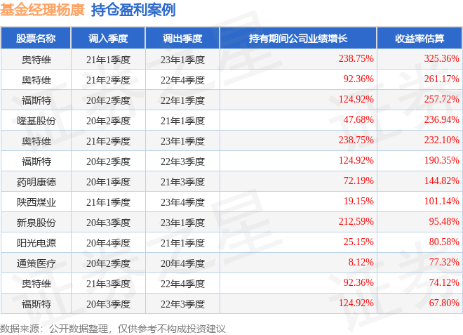 杨康管理的易方达鑫转增利混合A基金在21年1季度买入奥特维,在持有2年又0个季度后在23年1季度卖出。持有期间的估算收益率为325.36%,持有期间奥特维在2021年到2023年的年报归属净利润增幅达238.75%。