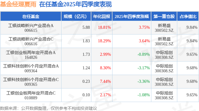 证券之星消息,截止2025年四季度末,基金经理夏雨旗下共管理6只基金,本季度表现最佳的为工银战略新兴产业混合A(006615),季度净值涨3.75%。