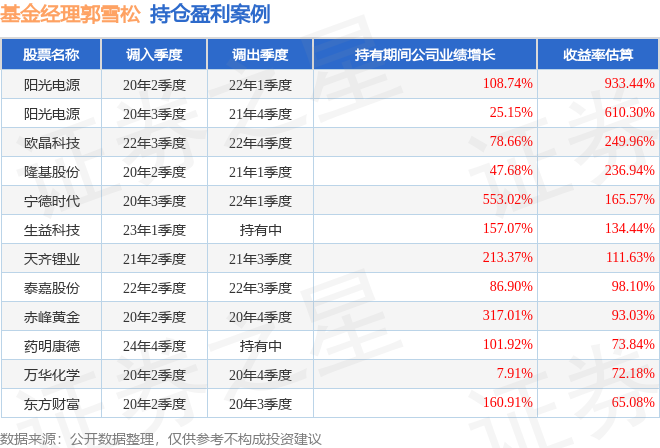 郭雪松管理的工银聚安混合A基金在22年2季度买入泰嘉股份,在持有1个季度后在22年3季度卖出。持有期间的估算收益率为98.1%,持有期间泰嘉股份在2021年到2022年的年报归属净利润增幅达86.9%。