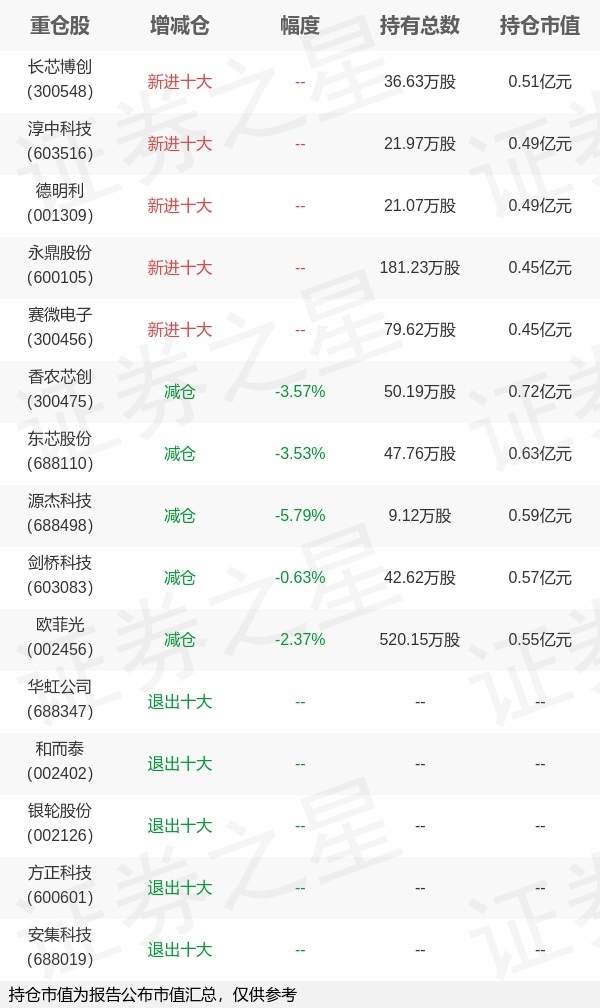 证券之星消息,1月22日富国基金旗下金泽宇管理的富国中证1000交易型开放式指数基金公布年报,近1年净值增长率41.07%。与上一季度相比,该基金前十大重仓股新增长芯博创,淳中科技,德明利,永鼎股份,赛微电子;其中香农芯创持仓占比0.55%,为该基金第一大重仓股;华虹公司,和而泰,银轮股份,方正科技,安集科技等退出前十大重仓股;详细数据如下: