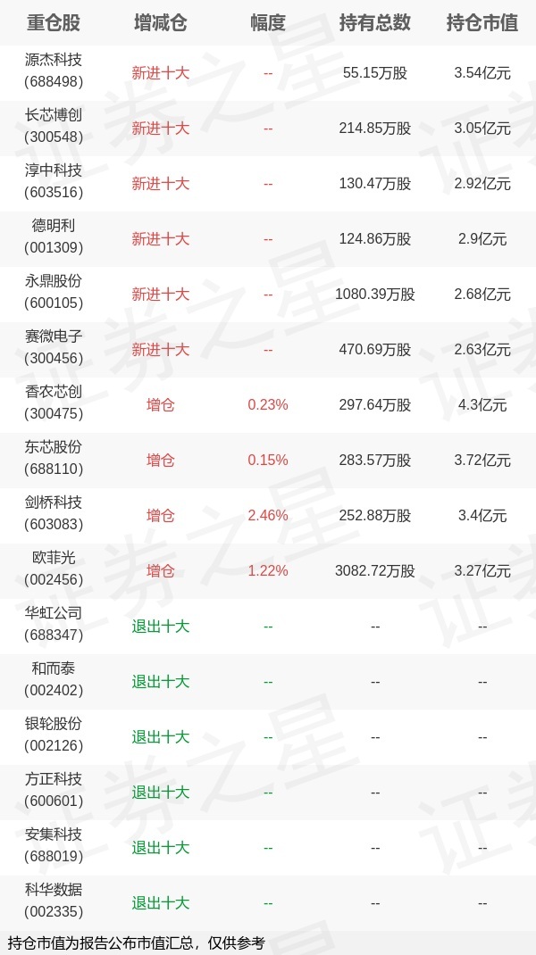 证券之星消息,1月22日南方基金旗下崔蕾管理的南方中证1000交易型开放式指数基金公布年报,近1年净值增长率41.52%。与上一季度相比,该基金前十大重仓股新增源杰科技,长芯博创,淳中科技,德明利,永鼎股份,赛微电子;并对香农芯创增仓0.67万股,为该基金第一大重仓股;华虹公司,和而泰,银轮股份,方正科技,安集科技,科华数据等退出前十大重仓股;详细数据如下:
