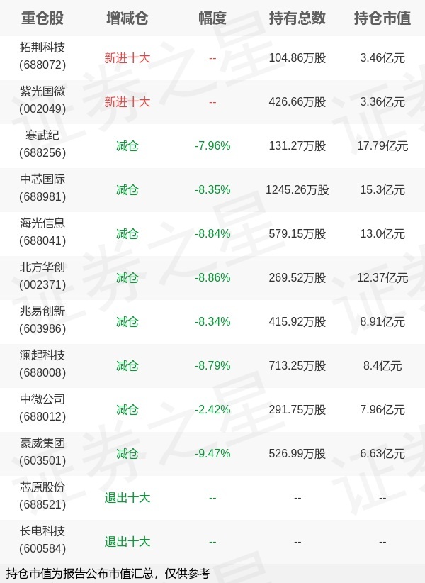 证券之星消息,1月22日国联安基金旗下黄欣 章椹元管理的国联安中证全指半导体产品与设备交易型开放式指数基金公布年报,近1年净值增长率70.1%。与上一季度相比,该基金前十大重仓股新增拓荆科技,紫光国微;其中寒武纪持仓占比8.82%,为该基金第一大重仓股;芯原股份,长电科技等退出前十大重仓股;详细数据如下:
