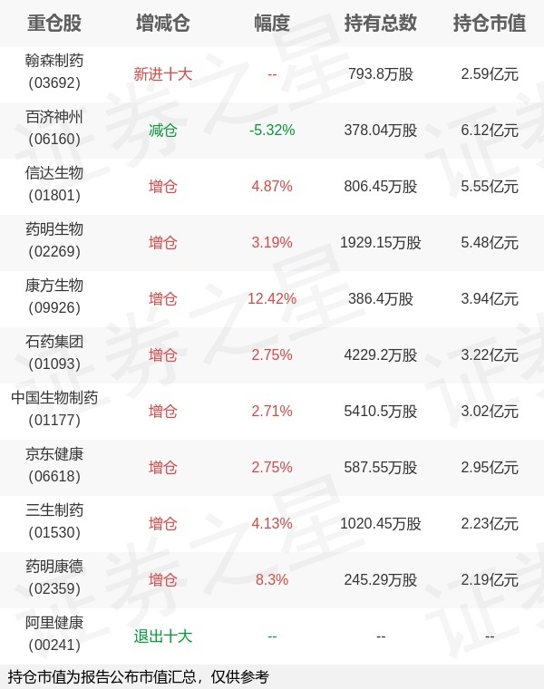 证券之星消息,1月22日博时基金旗下万琼管理的博时恒生医疗保健交易型开放式指数基金(QDII)公布年报,近1年净值增长率72.87%。与上一季度相比,该基金前十大重仓股新增翰森制药;其中百济神州持仓占比9.71%,为该基金第一大重仓股;阿里健康等退出前十大重仓股;详细数据如下:
