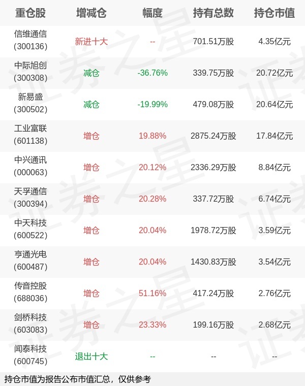 证券之星消息,1月22日国泰基金旗下艾小军管理的国泰中证全指通信设备交易型开放式指数基金公布年报,近1年净值增长率121.42%。与上一季度相比,该基金前十大重仓股新增信维通信;其中中际旭创持仓占比15.2%,为该基金第一大重仓股;闻泰科技等退出前十大重仓股;详细数据如下: