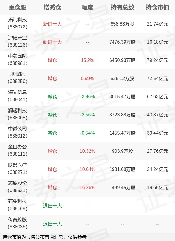 证券之星消息,1月22日华夏基金旗下荣膺管理的华夏上证科创板50成份交易型开放式指数基金公布年报,近1年净值增长率56.82%。与上一季度相比,该基金前十大重仓股新增拓荆科技,沪硅产业;并对中芯国际增仓851.03万股,为该基金第一大重仓股;石头科技,传音控股等退出前十大重仓股;详细数据如下: