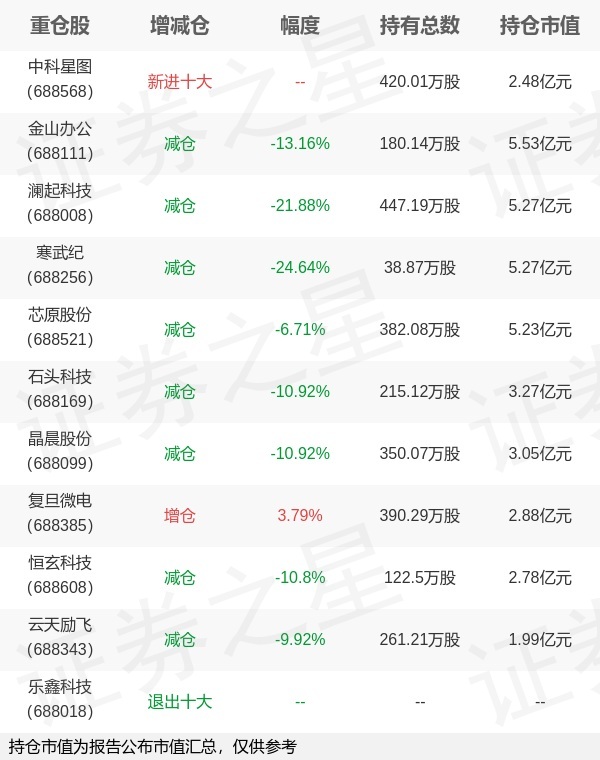 证券之星消息,1月22日博时基金旗下李庆阳管理的博时上证科创板人工智能交易型开放式指数基金公布年报,近1年净值增长率66.35%。与上一季度相比,该基金前十大重仓股新增中科星图;其中金山办公持仓占比9.81%,为该基金第一大重仓股;乐鑫科技等退出前十大重仓股;详细数据如下: