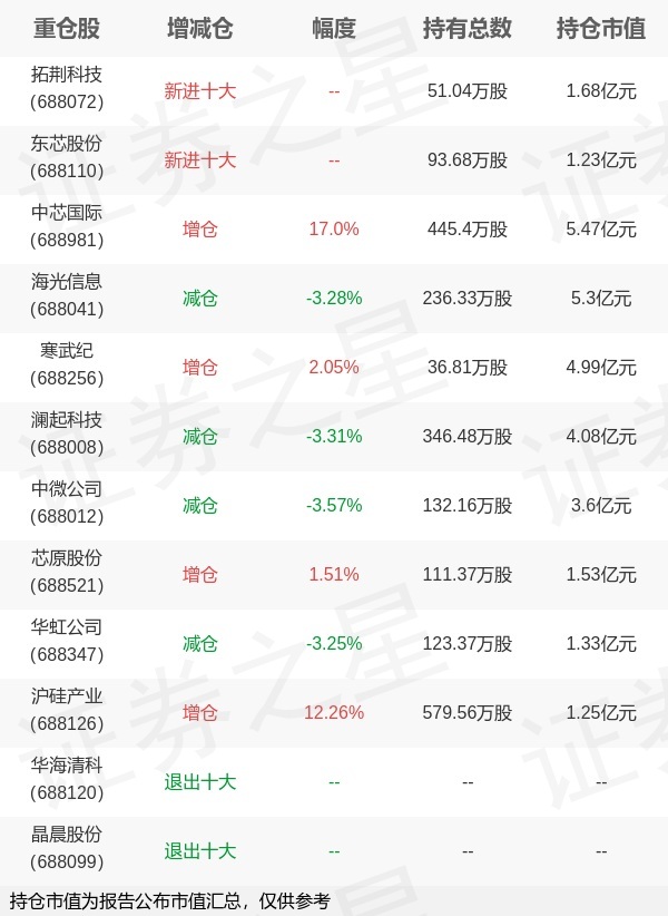 证券之星消息,1月22日汇添富基金旗下孙浩管理的汇添富上证科创板芯片交易型开放式指数基金公布年报,近1年净值增长率88.16%。与上一季度相比,该基金前十大重仓股新增拓荆科技,东芯股份;并对中芯国际增仓64.72万股,为该基金第一大重仓股;华海清科,晶晨股份等退出前十大重仓股;详细数据如下: