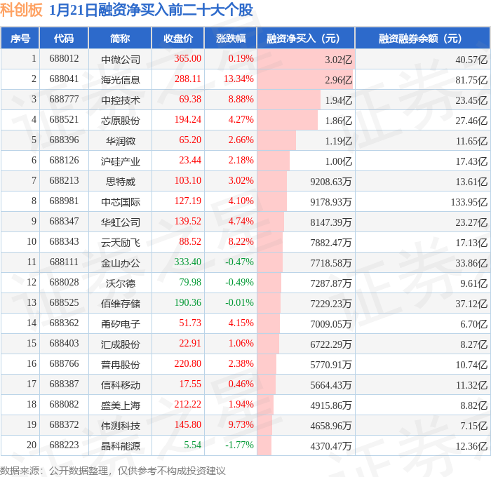 科创板融资净买入前三分别为:中微公司(688012)融资净买入3.02亿元、海光信息(688041)融资净买入2.96亿元、中控技术(688777)融资净买入1.94亿元,前20具体见下表: