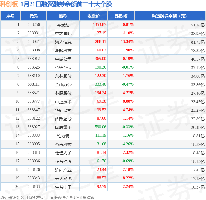 科创板融资融券余额前三分别为:寒武纪(688256)融资融券余额151.18亿元、中芯国际(688981)融资融券余额133.95亿元、海光信息(688041)融资融券余额81.75亿元,前20具体见下表:
