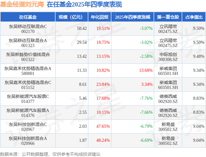 刘元海管理的东吴新趋势价值线混合基金在23年3季度买入新易盛,已连续持有2年又1个季度。持有期间的估算收益率为573.28%,持有期间新易盛在2023年到2025年的中报归属净利润增幅达1267.12%。