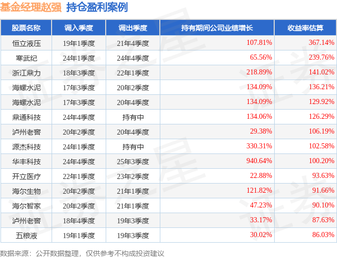 赵强管理的新华策略精选股票A基金在19年1季度买入恒立液压,在持有2年又3个季度后在21年4季度卖出。持有期间的估算收益率为367.14%,持有期间恒立液压在2019年到2021年的年报归属净利润增幅达107.81%。