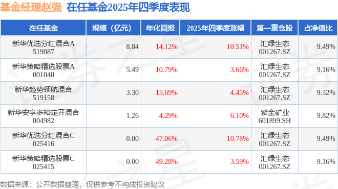 证券之星消息,截止2025年四季度末,基金经理赵强旗下共管理6只基金,本季度表现最佳的为新华优选分红混合C(025416),季度净值涨10.78%。