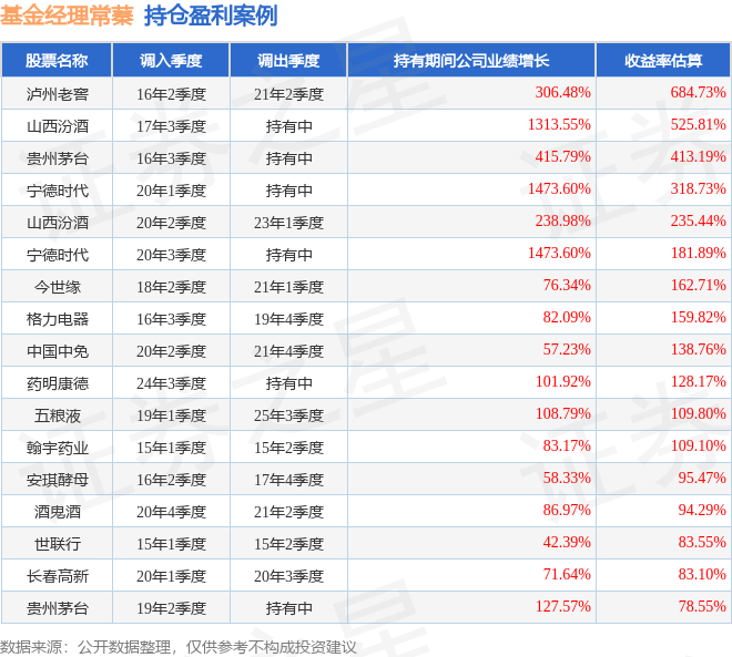 常蓁管理的嘉实回报混合基金在16年2季度买入泸州老窖,在持有5年又0个季度后在21年2季度卖出。持有期间的估算收益率为684.73%,持有期间泸州老窖在2016年到2021年的年报归属净利润增幅达306.48%。
