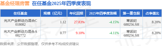 房雷管理的光大产业新动力混合A基金在24年2季度买入寒武纪,已连续持有1年又2个季度。持有期间的估算收益率为455.04%,持有期间寒武纪在2024年到2025年的中报营业总收入增幅达4347.82%。