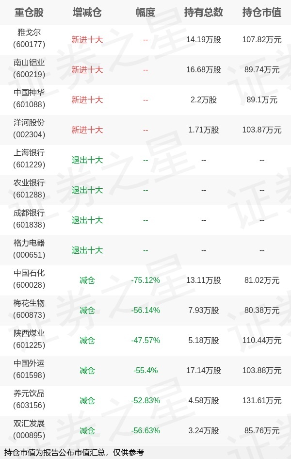 证券之星消息,1月22日南方基金旗下崔蕾管理的南方标普中国A股大盘红利低波50交易型开放式指数基金联接基金公布年报,近1年净值增长率6.7%。与上一季度相比,该基金前十大重仓股新增雅戈尔,南山铝业,中国神华,洋河股份;其中中国石化持仓占比0.01%,为该基金第一大重仓股;上海银行,农业银行,成都银行,格力电器等退出前十大重仓股;详细数据如下: